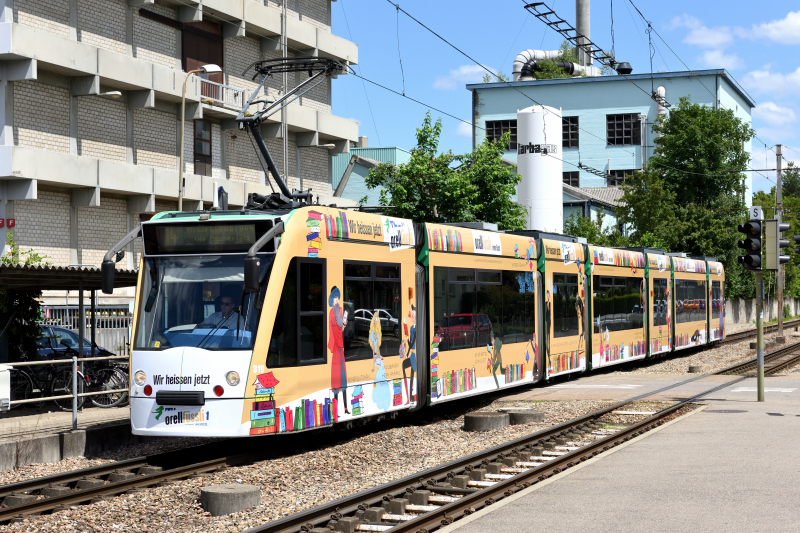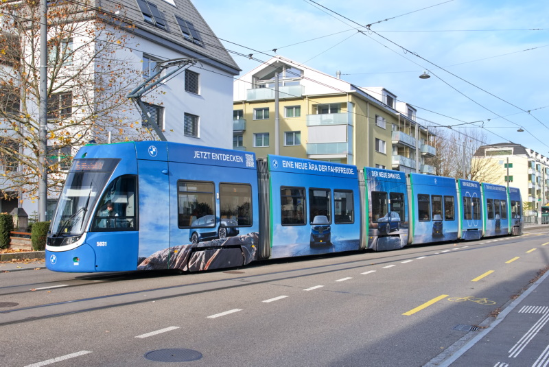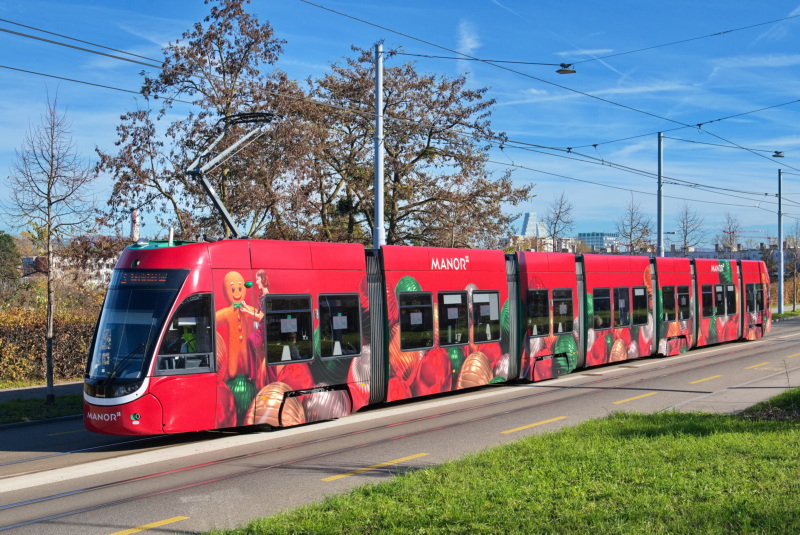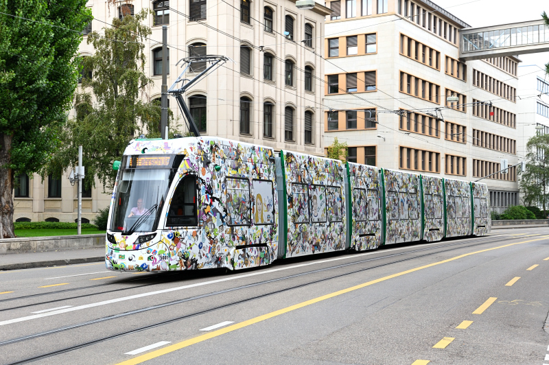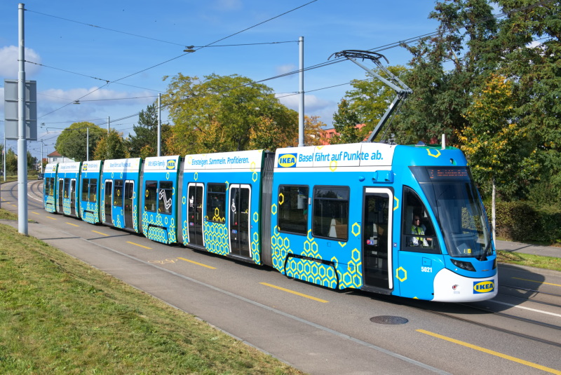 Um einerseits das Vorherrschen der Hausfarben Grün bzw. Gelb/Blutorange nicht zu beeinträchtigen und um andererseits einen optimalen Beachtungsgrad zu erreichen, wurde die Anzahl gleichzeitig verkehrender Ganzwerbefahrzeuge sowohl von den BVB als auch von der Baselland Transport AG (BLT) anfänglich bewusst beschränkt. Von diesem Grundsatz wichen insbesondere die BVB je länger je mehr ab. Beispielsweise verkehrten im Herbst 2022 rund zwanzig BVB-Strassenbahnwagen mit bezahlter Vollwerbung oder als sogenannte «Sujet-Trams», für die kein Erlös in die Kassen floss. Dies entsprach knapp einem Fünftel der Flotte! 1)