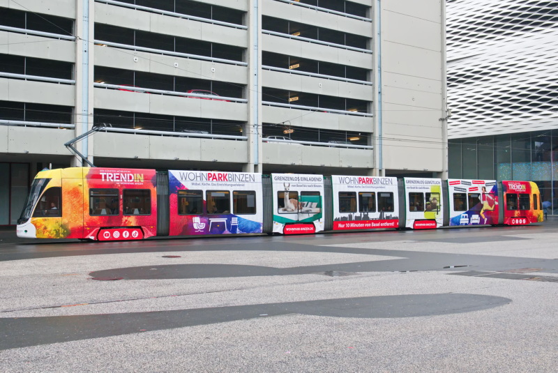 Um einerseits das Vorherrschen der Hausfarben Grün bzw. Gelb/Blutorange nicht zu beeinträchtigen und um andererseits einen optimalen Beachtungsgrad zu erreichen, wurde die Anzahl gleichzeitig verkehrender Ganzwerbefahrzeuge sowohl von den BVB als auch von der Baselland Transport AG (BLT) anfänglich bewusst beschränkt. Von diesem Grundsatz wichen insbesondere die BVB je länger je mehr ab. Beispielsweise verkehrten im Herbst 2022 rund zwanzig BVB-Strassenbahnwagen mit bezahlter Vollwerbung oder als sogenannte «Sujet-Trams», für die kein Erlös in die Kassen floss. Dies entsprach knapp einem Fünftel der Flotte! 1)