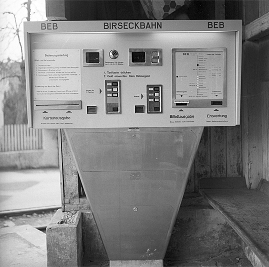 Die Mehrfahrtenkarten-Automaten der Birseckbahn dürften schon zu Beginn der Achtzigerjahre verschwunden sein. Das bei der Haltestelle Baselstrasse stehende Exemplar (mit der abgefallenen Nummer 16) wurde 1974, also noch vor der Tarifgemeinschaft mit der BVB, aufgenommen.