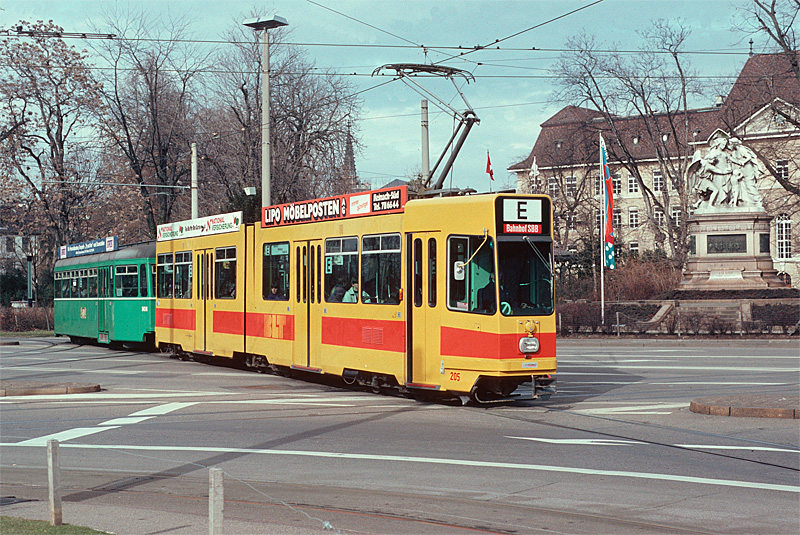 Rundum als Linie E beschilderter Zug, bestehend aus Be 4/6 205 und B 1414. Einsatz als Zusatzkurs zwischen Bahnhof SBB und Mustermesse während der MUBA 1992, der 76. Ausgabe der bis wenige Jahre zuvor noch Schweizerische Mustermesse genannten Frühjahres-Ausstellung.