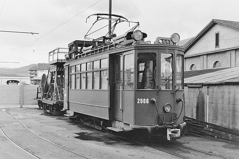 Werkzeugmotorwagen Xe 2/2 2006 mit Turmwagen X 2205 und Bobinenwagen X 2227. Der Fahrleitungsmontage-Zug der BVB steht am 8. April 1972 in der Zufahrt zur Oberbauwerkstätte Dreispitz.
