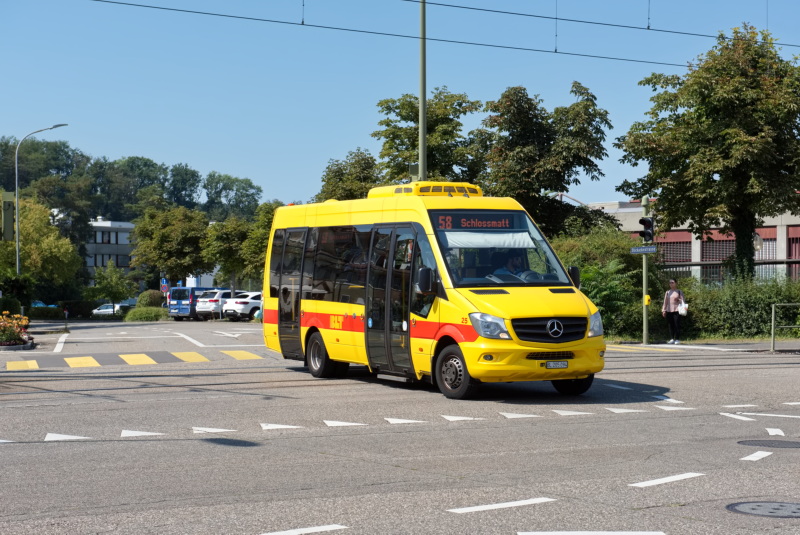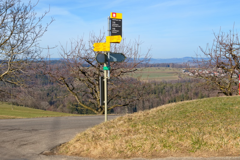 An dieser malerischen «Haltestelle» oberhalb von Häfelfingen halten seit Ende 2019 keine gelben Busse der Baselland Transport AG (BLT) mehr. Die Linie 110 wird ausschliesslich als Ruftaxi mit Grossraum-Limousinen oder Kleinbussen betrieben, welche aufgrund gänzlich fehlender Anschriften und Beschilderung nicht annähernd als Fahrzeuge des öffentlichen Verkehrs erkennbar sind.