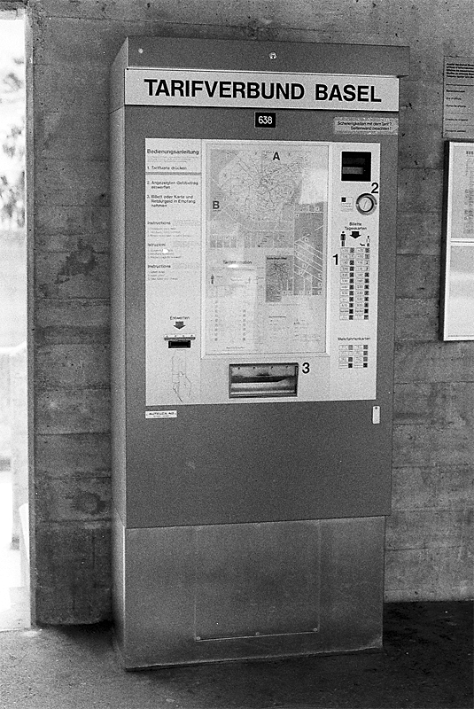Einzelbillett zu 90 Rappen, entsprechend Tarifstufe 1 (Erwachsene) bzw. 2/3 (ermässigt). Das Billett wurde am 23. Mai 1981 um 17:26 Uhr bei dem in Kleinhüningen (KH) stehenden Gerät Nr. 526 bezogen. Um 1988 entfiel die Standortnummer zugunsten eines Aufdrucks der Anzahl durchfahrbarer Zonen. Schon zuvor war Zeitangabe um einen Doppelpunkt ergänzt worden.