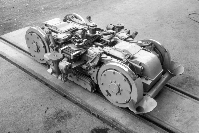 Simplex-Drehgestell des Ce 4/4 1 der Biel–Meinisberg-Bahn (BMB). Der längs eingebaute Motor bildete den Drehgestellrahmen und trieb beide Radsätze über Kegelradgetriebe an.