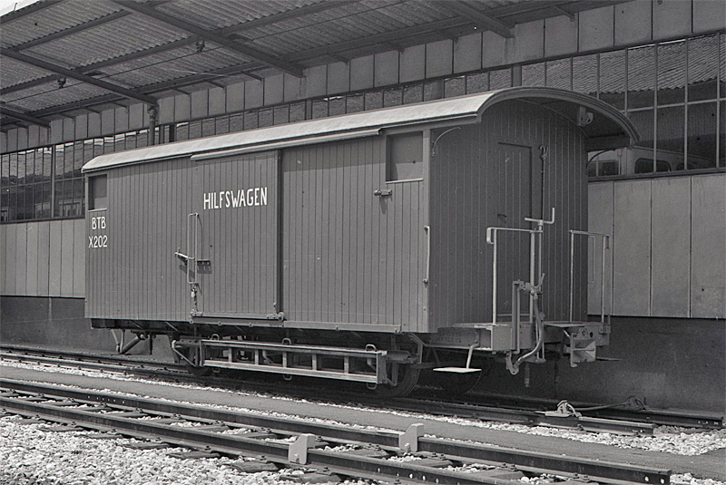 Der «neue» Hilfswagen X 202 entstand aus einem gedeckten Güterwagen, welchen die Birsigthalbahn AG 1954 bzw. 1956 von der Brünigbahn übernommen hatte. Am 11. Juni 1971 steht er beim Depot Oberwil.
